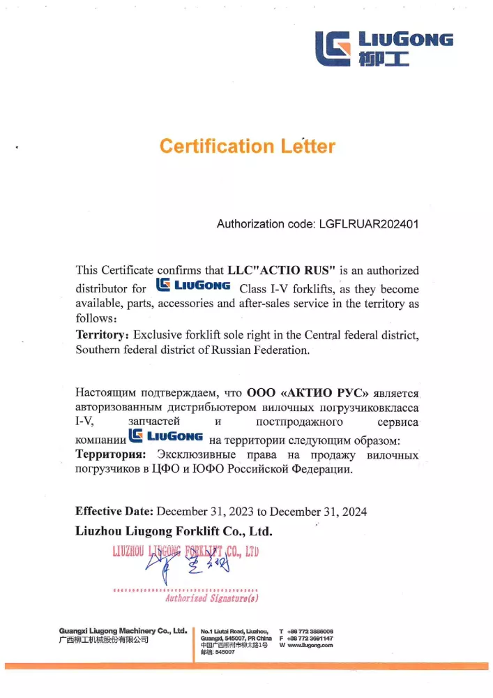 ООО "Актио Рус" является авторизованным дистрибьютором вилочных погрузчиков, запчастей и постпродажного сервиса компании LiuGong.